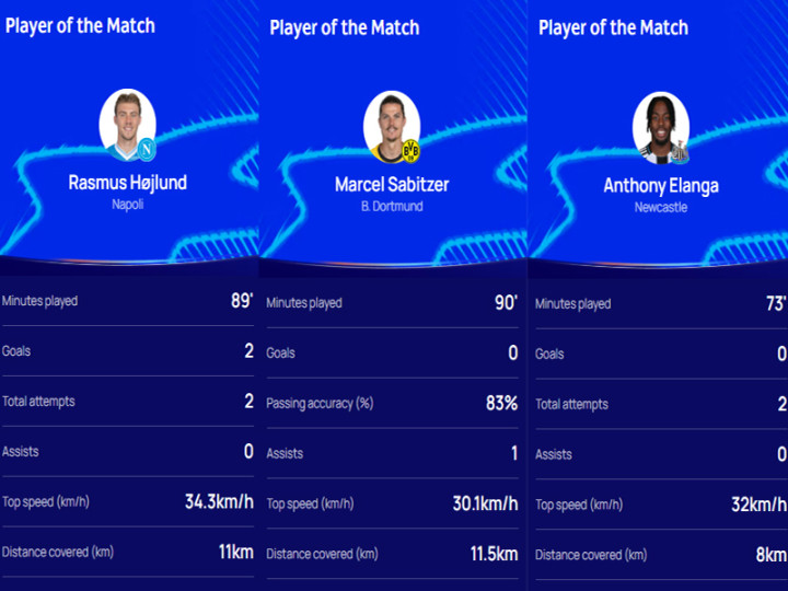 先看看全场最佳,根据欧足联官网发布的信息,来自那不勒斯的霍伊伦,多特蒙德的萨比策,还有纽卡斯尔的埃兰加,三名曼联旧将,赛后都被评选为全场最佳。同时,三支球队均迎来欧冠的首场胜利,首轮补时连丢两球,失去2分的多特蒙德,已经上升到积分榜的前八名。